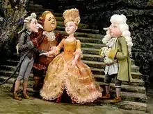 The film used all the techniques that digital puppet animation afforded to the animators when the movement started in the 1980s. The technique of replaceable articulation or the use of replaceable lower jaws of the character conditionally imitating speech was a major innovation in puppet animation.[4] The animators drew inspiration from the classic stop-motion films of Ivan Ivanov-Vano such as Go There, Don't Know Where and those by Tim Burton.[13] The film is constructed in the traditions of the 18th and 19th century. A recording of ancient 18th century minuets was used to describe the choreography of the dance partners in Hoffmaniada.[4]