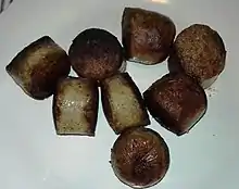 Hog's pudding is a type of sausage produced in Cornwall and Devon.[1] Popular variants of the recipe comprise of pork meat and fat, suet, bread, as well as oatmeal or pearl barley formed into a large sausage—also known as 'groats pudding' and are very similar to a white pudding, whereas other versions of the recipe contain a high percentage of offal such as lung and liver and can more accurately be described as a sort of West Country haggis.[2] It is much spicier than white pudding as it contains black pepper, cumin, basil and garlic. The sausage is usually around two inches in diameter.