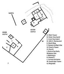 The castle was built on a rock wall that rises 250 m (820 ft) above the Viamala river and the important roads over the San Bernardino and Splügen Passes. A steep path leads from the valley floor to the eastern side of the wall. The area was inhabited during the Bronze and Iron Ages.[2] During the Roman era the current castle site was a religious site and by the 4th or 5th century there was a church on the site. It is unknown whether the church was originally built as a Christian church or was a temple to Mithras that was converted into a church.[3] By the 5th century a baptistery had been added and it was known as the Church of St. John. The church remained in operation over the next 1000 years.[4] It was the parish church for the left side of the Rhine river until 1500.[5] A first ring wall was probably added around the same time.