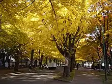 The abundance of accessible green space has continued to be popular not only among students, but also the general public, who can often be seen using the campus area in a similar way to a public park. Walking tours of the campus for interested foreign and domestic tourists are provided by several businesses in Sapporo, although no tour is needed to visit the campus.[15] Fall is an especially popular time for campus visits, with tourists and Sapporo residents flocking to get a view of the golden ginkgo trees that line Ginkgo Avenue.[16]