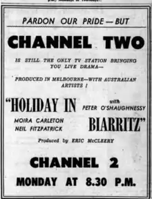 Advertisements said "pardon our pride but Channel Two is still the only TV station bringing you live drama – produced in Melbourne – with Australian artists."[4] Moira Carleton had been in the Melbourne TV production of Roundabout (1957), the first live drama from that city.