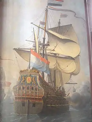 Hollandia was built by the Dutch East India Company in 1742 in Amsterdam to a new design, as a 32-gun, 700-ton ship with a length of 42 metres (138 ft).[1] On 3 June 1743 she left Texel as part of a Batavia bound fleet carrying a large amount of trade coin and several important passengers. On 13 July 1743 she became separated from the fleet and struck Gunner Rock near Annet, Isles of Scilly in the early hours of the morning, sinking nearby with the loss of all hands.[2]