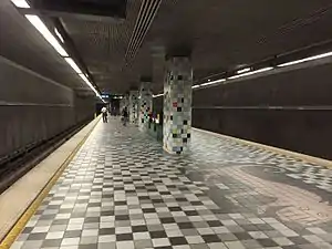 Hollywood/Western station has a single island platform oriented east–west under Hollywood Boulevard, with a mezzanine above. The single station entrance and elevator are located in a plaza on the southeast corner of the intersection.[3] The station was designed by Escudero–Fribourg Architects, while May Sun designed the interior finish and artworks, which reflect the neighborhood's immigrant heritage.[4] The walls and floors are covered by black, gray, and white tiles, with colorful highlights on the walls.[5] Armenian, Chinese, and Mayan symbols are depicted on granite pavers. Some wall panels display historic photographs of the neighborhood; others have depictions of fossils discovered during excavation of the station.[4] Sculptures of two Pacific Electric Red Cars hang over the platform from the mezzanine wall.[6]