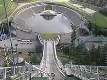 During summer, the old hill had a lake, which made it possible to use the amphitheater for concerts, plays and entertainment. The venue was then often referred to as Sommerkollen.[21] From 1963, a temporary, small in-run was built down the southern grandstand, which allowed skiers and divers to make a jump and land in the water. Between 1963 and 1983, a competition was held nine times.[18] Starting in 1983 was Ta sjansen, which was televised annually by the Norwegian Broadcasting Corporation and became Sommerkollen's most popular show. It was an informal competition with two main events: one where a home-made craft was to first slide down a short in-run and then slide along the water surface to hit a mounted bell in the shortest possible time. The other was a cycling competition where the cyclist had to complete a track on a wobbly floating wharf.[21]