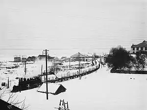 The passenger transport from Hvittingfoss increased until the 1910s, when it stabilized at about 50,000 passengers per year, before peaking at 90,910 in 1918.[20] However, high coal prices drew up operating costs, even though the railway in part started using wood as fuel. The company had a deficit of NOK 30,293 in 1918. The next two years the ridership fell by a third, while the company's costs for fuel increased to NOK 80,424 to NOK 156,540.[25] The company went with a loss until 1923, when traffic started increasing again. The highest profit, of NOK 61,602, was recorded in 1925. The following year Hasestad Station burned down in a fire,[26] and the wharfs in Holmestrand collapsed because it could not support the amount of pulp being stored there. Freight traffic continued to fall in the following years.[27] Patronage until the late 1920s, when between 20,000 and 30,000 passengers per year were transported.[20]