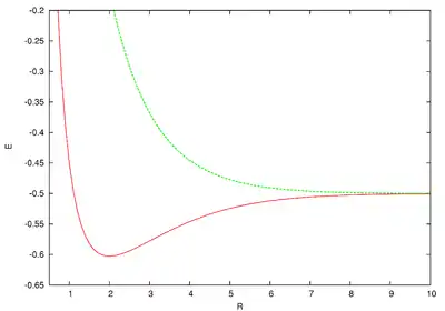 where is a differential surface element of the mid-plane. This is the Holstein–Herring formula. From the latter, Conyers Herring was the first to show[3] that the lead term for the asymptotic expansion of the energy difference between the two lowest states of the hydrogen molecular ion, namely the first excited state and the ground state (as expressed in molecular notation—see graph for energy curves), was found to be: