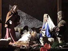 At the southern external wall of the steeple ends the bell chair basic bar in four winged animal figures with the heads of a human, a lion, a bull and an eagle. They symbolize the four evangelists Matthew, Mark, Luke and John. On the four girders is an inscription with a text from the First Epistle to the Corinthians (1 Corinthians 1, 23–24): Wir aber predigen Christus den Gekreuzigten, Christus Kraft und Gottes Weisheit (=But we preach Christ crucified, Christ the power of God, and the wisdom of God). Below the four animal figures is a plaster relief of the Veil of Veronica.[7] The relief was created by the sculptor Arnold Hensler from Wiesbaden. At the western and the eastern side of the bell steeple are each with a turret clock without cyphers. On property are in addition the 1957 established kindergarten, a parsonage building with a parish office and dwellings, a building with group and club areas, as well as a football pitch used by young people. The parish kindergarten of St. Josef was expanded in 2011 by another building in the former parish court on Ortenberger Straße.