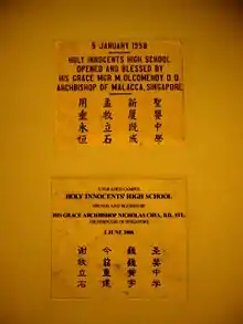 Holy Innocents' High School was founded as Tao Nan School in 1892, as one of the first Chinese Mission Schools in Singapore.[1] Bible studies and classical Chinese were taught. In 1920, the name of the school was changed from Tao Nan to Holy Innocents' Boy School. It means pure, wholesome and innocent. Between 1942 and 1945, Holy Innocents' Boys School was administered by the Japanese as Syonan School.[2] In 1957, a two-storey building consisting of 12 classrooms was built at 7.25 miles off Upper Serangoon Road.