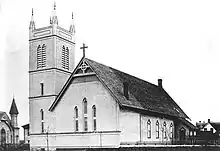 In order to pick a site for the new church, legend has it that Father Fay went to the Coal Harbour waterfront, looked south towards the forested land (present-day Downtown Vancouver) and chose the area that contained the tallest tree. Construction began in 1886 and the wooden church was completed and blessed in the following year. Two years later, the church was enlarged and a bell tower was added.[7][9]