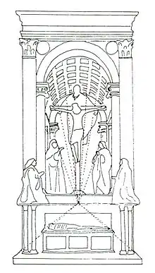 The Trinity is noteworthy for its inspiration taken from ancient Roman triumphal arches and the strict adherence to recently developed perspective techniques, with a vanishing point at the viewer's eye level,[3] so that, as Vasari describes it "a barrel vault drawn in perspective, and divided into squares with rosettes that diminish and are foreshortened so well that there seems to be a hole in the wall."[4] This artistic technique is called trompe-l'œil, which means "deceives the eye," in French. The fresco had a transforming effect on generations of Florentine painters and visiting artists. The sole figure without a fully realized three-dimensional occupation of space is the majestic God supporting the Cross, considered an immeasurable being. The kneeling patrons represent another important novelty, occupying the viewer's own space, "in front of" the picture plane, which is represented by the Ionic columns and the Corinthian pilasters from which the feigned vault appears to spring; they are depicted in the traditional prayerful pose of donor portraits, but on the same scale as the central figures, rather than the more usual 'diminution', and with noteworthy attention to realism and volume.