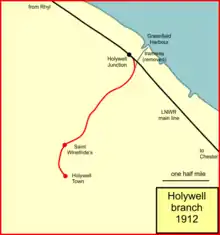 The Holywell branch line was a railway branch line in North Wales that connected Holywell with the nearby main line railway. Holywell had plentiful mineral resources, and the branch line was built as a mineral railway. When the local industry declined, the line fell into disuse, but it was reopened as a tourist passenger line in 1912. Road competition made heavy inroads into that business, and the line closed in 1954.