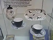 The pattern was a distinctive black on white featuring illustrations of the latest home furnishings and utensils against a background of irregular black lines. Items illustrated included a boomerang or kidney shaped table, a Robin Day armchair, a Gordon Russell type sideboard, plant holders on legs, tripod lights and lamp shades, and a two seat Sigvard Bernadotte style sofa.[1] Some very curved elements, such as teacups and lids, were plain black.