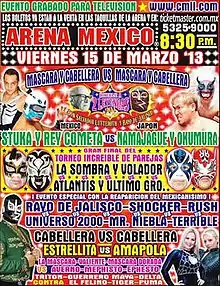 On February 21, 2013 CMLL held a press conference to officially announce that the Homena a Dos Leyendas would pay tribute to Rayo de Jalisco ("The Lighting from Jalisco") and brought out Rayo's son, Rayo de Jalisco Jr., as part of the announcement. Rayo de Jalisco Jr. had not worked for CMLL since 2010 but made a special appearance due to the company honoring his father. During the press conference Rayo de Jalisco Jr.'s long time rival Universo 2000 interrupted Rayo de Jalisco Jr. and the two ended up challenging each other to a match that would take place at the 2013 Homenaje a Dos Leyendas, although the exact nature of the match was not announced at the time. The rivalry between the two wrestlers hailed back to at least 1997 where Universo 2000 defeated both Cien Caras and Rayo de Jalisco Jr. to win the CMLL World Heavyweight Championship.[28][29] Universo 2000 defended the title three times during his reign: against Brazo de Plata, Máscara Sagrada, and Rayo de Jalisco Jr., before losing the championship to Rayo de Jalisco Jr. on September 13, 1998.[28] Universo 2000 regained the title on December 10, 1999[29] Universo 2000's second reign became a recordbreaking reign in several areas, it was the longest to date as it lasted 1,225 days. He also became the champion with most successful title defenses in one reign including eight defenses against Rayo de Jalisco Jr. during their long running rivalry.[29] After being masked since his debut in 1985 Universo 2000 lost a Lucha de Apuesta match to El Canek in the main event of the 71st Anniversary Show, on September 17, 2004, the match also included Rayo de Jalisco Jr. and Dr. Wagner Jr. and originally came about due to the Universo 2000/Rayo de Jalisco Jr. rivalry.[30] Following his unmasking Universo 2000 won the 2004 Leyenda de Azul (Blue legend tournament).[31] In subsequent years both Universo 2000 and Rayo de Jalisco Jr. left CMLL. In 2005 Rayo de Jalisco Jr. suffered another serious injury, he injured both his knees in a match against Universo 2000's brother Máscara Año 2000, where his legs got caught on the ropes as he jumped out of the ring and he tore ligaments in both knees. The injury kept him out of the ring for almost half a year but in the end Rayo de Jalisco Jr. was able to make a full recovery and return to the ring.[32] The incident was used by several promoters as well as Rayo de Jalisco Jr. himself to create more interest in matches between himself and Universo 2000, Cien Caras and Máscara Año 2000. Rayo de Jalisco Jr. made his return to CMLL in May, 2010, siding with the CMLL loyalists in their feud with Los Invasores, especially Invasore members Universo 2000 and Máscara Año 2000, reigniting the long running storyline between them.[33] But Rayo, Universo and Cien Caras only worked a select few dates for CMLL before leaving again. The official match between the long time rivals saw each team up with participants of the 2013 Torneo Parejas Increibles, only in this case they were on opposite sides instead of teaming up. Rayo de Jalisco Jr. would team up with Shocker and Rush while Universo 2000 would team up with Shocker's rival Mr. Niebla and Rush's rival El Terrible. Shocker and Mr. Niebla had a long backstory between then, having actually worked together as a regular tag team in the late 1990s. In 1998 the two defeated Dr. Wagner Jr. and Emilio Charles Jr. to win the CMLL World Tag Team Championship and would subsequently defend the tag team championship against teams such as Blue Panther and Black Warrior, Bestia Salvaje and Scorpio Jr. and the Hermanas Dinamita (Cien Caras and Universo 2000). In October, 1998 Mr. Niebla suffered an injury during a match, an injury that was so severe that Mr. Niebla was forced to vacate the Tag Team title.[34] Upon his return Mr. Niebla continued to team with Shocker but the team were not able to win the Tag Team title back. On September 24, 1999, at the CMLL 66th Anniversary Show, the team of Nr. Niebla and Shocker faced Atlantis and Villano III in a Relevos suicida match, a match where the losing team would fight each other for their mask. In the main event match of CMLL's 66th Anniversary show, Atlantis and Villano III defeated the much less experienced team, afterwards Mr. Niebla defeated Shocker to unmask him.[35] In the years since Shocker's unmasking the two have wrestled each other on numerous occasions, both in CMLL and other promotions. The two teamed up for the Parejas Increibles tournament and made it to the semi-final but lost to La Sombra and Volador Jr. when the tension between the two became a distraction in the match.[24][25] The rivalry between Rush and El Terrible started when El Terrible defeated Rush in the finals of a tournament to determine a holder of the CMLL World Heavyweight Championship on January 1, 2012.[36] The two were also paired up for the 2012 Torneo Nacional de Parejas Increibles, and in the weeks leading up to the tournament Rush stated that he was willing to set aside his differences with El Terrible as he wanted to win the Parejas Increibles tournament, despite the two having developed a heated rivalry over the last number of months.[37] After getting along and qualifying for the final match Rush and El Terrible's miscommunication and dissension allowed their opponents to win the match and the tournament. Following the match Rush took a microphone and berated both El Terrible and the fans for their actions that night and then followed it up by challenging El Terrible to a Luchas de Apuestas, hair vs. hair match at a later date. El Terrible did not accept the challenge at that point in time.[38] The two faced off in the main event of the CMLL 79th Anniversary Show in a Lucha de Apuestas, hair vs. hair match that was won by Rush.[10] The storyline continued to develop in the months following the anniversary event and included El Terrible successfully defending the CMLL World Heavyweight Championship against Rush on January 22, 2013.[39][40] Th