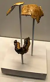 The first recognised remains—OH 7, partial juvenile skull, hand, and foot bones dating to 1.75 million years ago (mya)—were discovered in Olduvai Gorge, Tanzania, in 1960 by Jonathan Leakey. However, the actual first remains—OH 4, a molar—were discovered by the senior assistant of Louis and Mary Leakey (Jonathan's parents), Heselon Mukiri, in 1959, but this was not realised at the time.[2] By this time, the Leakeys had spent 29 years excavating in Olduvai Gorge for early hominin remains, but had instead recovered mainly other animal remains as well as the Oldowan stone-tool industry. The industry had been ascribed to Paranthropus boisei (at the time "Zinjanthropus") in 1959 as it was the first and only hominin recovered in the area, but this was revised upon OH 7's discovery.[2] In 1964, Louis, South African palaeoanthropologist Phillip V. Tobias, and British primatologist John R. Napier officially assigned the remains into the genus Homo as, on recommendation by Australian anthropologist Raymond Dart, H. habilis, the specific name meaning "able, handy, mentally skillful, vigorous" in Latin.[3] The specimen's association with the Oldowan (then considered evidence of advanced cognitive ability) was also used as justification for classifying it into Homo.[4] OH 7 was designated the holotype specimen.[3]