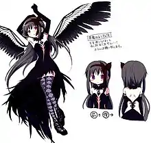 The anime staff designed Homura's weapons, while her bow, used in the final episode, is based on an illustration drawn by Ume Aoki.[12] Urobuchi did not originally write the pair of black wings Homura sprouts in the series' final episode in the script. Production designers Gekidan Inu Curry added this detail. Urobuchi was happy with the addition as it added more "mystery and depth" to the character.[6]