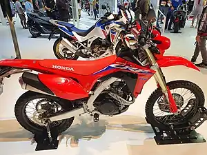 The Honda CRF450L (known as CRF450RL since 2020)[1] is a CRF series 450 cc (27 cu in) dual-sport motorcycle made by Honda. It was announced in May 2018 and available from September of the same year.[6] It is the fifth member of CRF dual-sport lineup (-L suffix) offered by Honda, after CRF230L, CRF250L, CRF1000L Africa Twin and CRF150L. Unlike other bikes from this lineup, the frame and engine of the CRF450L are directly taken from CRF450R motocross and CRF450X enduro bikes, while the other bikes such as CRF150L and CRF250L do not share anything from its motocross and enduro counterparts.