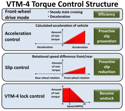 All first generation Ridgelines came equipped with a heavy-duty radiator, auxiliary transmission and power steering coolers, and dual 160 watt (W) radiator fans to support hauling and towing duties.[16][20] The Ridgeline also came equipped with a variable torque management four-wheel drive (VTM-4) system—co-developed with BorgWarner[29]—that provides front-wheel drive for dry-pavement cruising and engages all-wheel drive to improve acceleration, stability, maneuverability, and off-road performance.[3] The VTM-4's electromagnetically driven clutch-operated differential[29] can transfer up to 70% of available torque to the rear-axle when needed. The VTM-4 system can also be electronically locked providing maximum torque to the rear wheels for better handling of adverse terrain or to assist the driver in becoming unstuck.[3] Additionally, the first generation Ridgeline came equipment with a four-channel electronic stability control system—what Honda calls Vehicle Stability Assist (VSA)—that is designed to enhance control during acceleration, cornering, and collision-avoidance maneuvers and can be manually disabled to prevent undesirable throttle intervention in off-road conditions.[3]