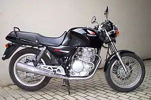 The Honda XBR 500 is a 500cc Japanese sports motorcycle launched by Honda in 1985 and in response to the Yamaha SR500. It is powered by a single-cylinder four-valve engine with the valves arranged radially relative to the geometric centre of the hemispherical combustion chamber - (the Radial Four Valve Combustion Chamber, or RFVC) and actuated via intermediate sub-rockers. Displacing 498 cc (30.4 cu in) and producing 27 or 44 hp (depending upon specific market legislation), the engine, having its origins in the Honda XR series off-road models, features a dry sump, the oil being stored in a separate tank below the seat. The steel-braided hoses connecting the oil tank to the engine (clearly visible at the right-hand side of the motorcycle) are a strong visual element.