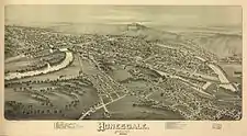 The discovery of anthracite coal in northeastern Pennsylvania in the early 1800s and the need to transport this valuable fuel to New York City gave birth to the Delaware and Hudson Canal, the American Railroad, and the Borough of Honesdale.[15] Honesdale was named for Philip Hone, former Mayor of New York and president of Honesdale's Delaware & Hudson (D&H) Canal Company. Honesdale, originally called "Dyberry Forks," was laid out as a village in 1826 when the D & H Canal was created.[1] It was incorporated as a borough on January 28, 1831.[3]
