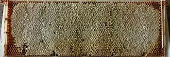 Normally, the honey is stored by honey bees in their beeswax honeycomb; in framed bee hives, the honey is stored on a wooden structure called a frame. The honey frames are typically harvested in the late summer, when they will be most filled with honey. On a completely filled frame, the cells will be capped over by the bees for storage; that is, each cell containing honey will be sealed with a capping made of beeswax.