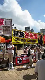 The 2012 protest on 1 July was the largest yet, with activists claiming 400,000 took part and police claiming 63,000 took part, both of which would have been the largest attendance at 1 July protests.[33] These protests coincided with the 15th anniversary of the handover of Hong Kong attended by CPC General Secretary Hu Jintao and his swearing in of new chief executive CY Leung, who is alleged to be a closet member of the Chinese Communist Party,[34] and has conflicts of interests over his business interests and has had unauthorised building work at his home.[35]