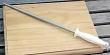A honing steel, sometimes referred to as sharpening steel, whet steel, sharpening stick, sharpening rod, butcher's steel, and chef's steel, is a rod of steel, ceramic or diamond-coated steel used to restore keenness to dulled blade edges. They are flat, oval, or round in cross-section and up to 30 centimetres (1 ft) long. The steel and ceramic honing steels may have longitudinal ridges, whereas the diamond-coated steels are smooth but embedded with abrasive diamond particles.[2]