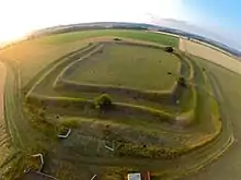 To the east of Honington are earthwork remains of an Iron Age fort, measuring 130-metre (430 ft) by 116-metre (381 ft) with defensive banks and ditches. There a hoard of Roman coins was found in 1691, although an investigation in 1976 could find no evidence of Roman occupation.[1][2] The 1885 Kelly's Directory view of the earthworks "on the heath near the village" is that it is the site of a Roman Camp with fosse and vallum.[3]