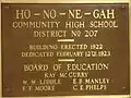 Hononegah Community High School opened in 1923. The school is named after the Native American Hononegah, wife of Stephen Mack Jr. Stephen Mack Jr. is credited to the founding of Rockton, Illinois.[1] The school's namesake is honored with a large mural of Hononegah in the school's main lobby.