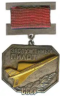 The Honorary Title "Honoured Pilot of the USSR" (Russian: Заслуженный пилот СССР) was a state civilian award of the Soviet Union established on September 30, 1965 by Decree of the Presidium of the Supreme Soviet of the USSR № 3993-VI[1] to recognise excellence in civilian aviation. It was abolished on August 22, 1988 by Decree of the Presidium of the Supreme Soviet № 9441-XI.[2]