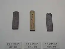 Hopae were identification tags carried by Koreans during the Joseon dynasty, recording the bearer's name, place of birth, status and residence.[1]
