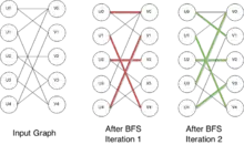The algorithm was found by John Hopcroft and Richard Karp (1973) and independently by Alexander Karzanov (1973).[3] As in previous methods for matching such as the Hungarian algorithm and the work of Edmonds (1965), the Hopcroft–Karp algorithm repeatedly increases the size of a partial matching by finding augmenting paths. These paths are sequences of edges of the graph, which alternate between edges in the matching and edges out of the partial matching, and where the initial and final edge are not in the partial matching. Finding an augmenting path allows us to increment the size of the partial matching, by simply toggling the edges of the augmenting path (putting in the partial matching those that were not, and vice versa). Simpler algorithms for bipartite matching, such as the Ford–Fulkerson algorithm‚ find one augmenting path per iteration: the Hopcroft-Karp algorithm instead finds a maximal set of shortest augmenting paths, so as to ensure that only iterations are needed instead of iterations. The same performance of can be achieved to find maximum cardinality matchings in arbitrary graphs, with the more complicated algorithm of Micali and Vazirani.[4]