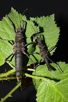 During the day, the stick insects hide in the leaves or vegetation near the ground. At night they climb up the food plants, never climb areas that are far from the ground. The eggs, which are 3.3 to 3.9 millimetres (0.13 to 0.15 in)s long and 2.5 to 3.0 millimetres (0.098 to 0.118 in) wide, are laid in the ground by the females with the ovipositor. They have a bulging dorsal area and, as a result, a lid (operculum) that slopes downwards towards the ventral side. The nymphs need an average of six months to hatch, but depending on the climate it can be three to eight months. Until the moulting to imago passes again at least half a year.[2][6][7]