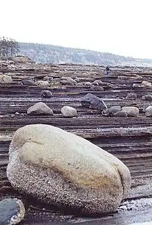 Fossil collectors have found Ammonite and Baculite fossils at Boulder Point on Hornby Island.[4] A species of saurodontid fish (previously considered a pterosaur) called Gwawinapterus beardi was identified based on a fossil found on a beach on Hornby Island.[5]