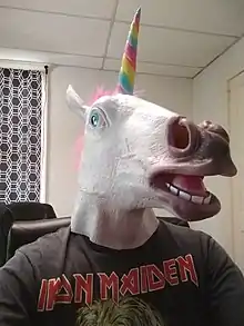 The horse head mask is a latex mask representing a horse head originally manufactured by novelty purveyor Archie McPhee, and now widely available from other manufacturers. The mask covers the entire head and is typically part of a Halloween costume, or at other times to be funny, shocking, incongruous, or hip, or to disguise one's identity. It has also become an internet meme.[2]