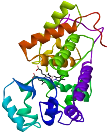 The structure of the enzyme was first solved by X-ray crystallography in 1997[2] and has since been solved several times with various substrates.[3] It is a large alpha-helical glycoprotein which binds heme as a redox cofactor.