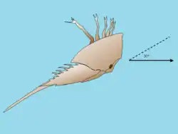 The entire body of the horseshoe crab is protected by a hard carapace. It has two compound lateral eyes, each composed of about 1,000 ommatidia, plus a pair of median eyes that are able to detect both visible light and ultraviolet light, a single parietal eye, and a pair of rudimentary lateral eyes on the top. The latter become functional just before the embryo hatches. Also, a pair of ventral eyes is located near the mouth, as well as a cluster of photoreceptors on the telson. Having relatively poor eyesight, the animals have the largest rods and cones of any known animal, about 100 times the size of humans,[15][16] and their eyes are a million times more sensitive to light at night than during the day.[17] They use their chelicerae—a pair of small appendages—for moving food into the mouth. The next five pairs of appendages, the first of which are the pedipalps, are used for locomotion (ambulatory legs). The mouth is located in the center of the legs, whose bases are referred to as gnathobases, and have the same function as jaws and help grind up food.[18] In extant species their appendages are uniramous, but the fossil genus Dibasterium had four pairs of branched walking legs.[19] The pedipalps on a male change shape on their terminal molt, becoming boxing glove-like claspers that are used for grasping the female during mating. The last pair of legs for both male and female are the main legs used for pushing when walking on the ocean floor. The remaining leg pairs have a weak claw at the tip.[20] Lost legs or the telson (tail) may slowly regenerate, and cracks in the body shell can heal.[21]