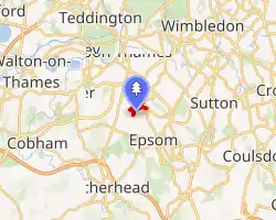 The park is a wooded recreation and amenities area occupying the east of a narrow upland watershed between two tributaries of the Hogsmill River (the Bonesgate Stream and the Horton Stream) . As such, the summit being the parish divide, it is in traditional terms, within Epsom parish and occupies land due west of the town, and due east of the semi-rural, semi-urban London district of Chessington.[3]