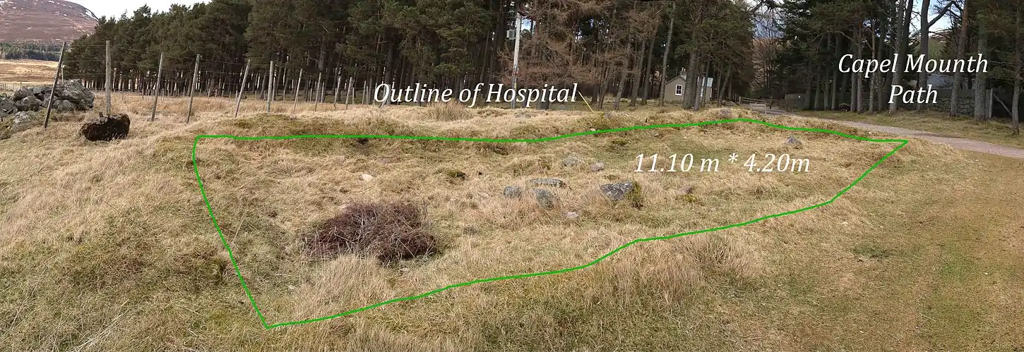 These paths had stopping places for travellers and as a result a number of the hospitals were located adjacent to or on these routes. In addition, where paths crossed rivers by bridges, fords or ferries, traveller's inns were located. It is notable that the Mounth passes also linked Castles across the whole of Scotland. This is clearly shown in the north east. It appears that the location of Hospitals on Mounth paths (e.g. Kincardine O’Neil, Spital of Loch Muick and perhaps the hospital at Boat O’Brig on the River Spey) were associated with travellers between settlements and castles. Simpson (1928) provides a detailed analysis of the Castles of Mar and their association with Mounth paths.[24] The Cairnnamount path links Castlehill, Kincardine O’Neil and Lumphanan castles.[25] The Capel Mounth, after traversing Loch Muick, passes Kinord Castle and the Loch Davan Motte before running past Migvie Castle. A western branch of the Capel Mounth path passes Loch Callater – to the west of Loch Muick – to Kindrochit and Braemar castles before leading towards Corgarf Castle.