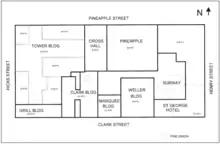 The 100 Henry Street entrance, also known as the "Weller Wing" of the St. George and previously the hotel main entrance, is now part of Educational Housing Services (EHS), which provides dormitory service to NYC area university students. This same entrance also allows access to the EHS-owned "Studio Wing". In 2005, EHS expanded their St. George operations and opened a new wing of the building at 55 Clark Street known as Clark Residence constructed over the site of the hotel building destroyed by fire in 1995. EHS houses 1,200 domestic and international students.[10] Street level house shops, restaurants, and charming neighborhood shops occupy the street fronts on Clark and Henry. The subway entrance is located on the Henry Street entrance.