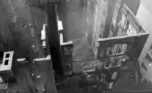 Both Ladder companies 110 and 118 made entry into the Clark structure. The building was equipped with a standpipe-Siamese connection so the engine companies proceeded up the stairway with rolled packs of 2.5-inch hose. As they ascended the stairs, they noticed numerous large holes in the floors (made to remove furniture and fixtures) which stopped them in their tracks. This was relayed to BC-31 and the crews proceeded to do a quick primary search for any vagrants who might still be in the building. When the engine crews arrived to the eighth floor, they observed heavy fire above them on the ninth floor which was dropping down through the various openings into the eighth. Firefighters connected their lines to standpipe outlets on the eighth floor and prepared to attack the fire. Outside, Fire hydrant and Siamese connections were made and the standpipe supplied. Unbeknownst to the firefighters at the time, the standpipe had been vandalized with parts of the pipe missing so the water never made it up to the firefighters. The interior fire crews then descended to the fourth floor and dropped their lines out of windows to members below for an exterior stretch. The fire had grown rapidly during this time and consumed almost all of the 8th, 9th and 10th floors. In addition to its vertical progression, it had also extended downward via holes, stairways and elevator shafts and horizontally into exposure #4, the Marquee building, through open interconnecting doorways on several floors. A second alarm and a request for an additional 95-foot tower ladder were transmitted at 4:02 a.m. by BC-31. The Field Communications Unit and Maxi-water system responded automatically on a second alarm.[4]