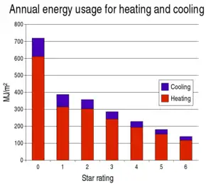 A 5-Star rating indicates that a building achieves a high level of thermal energy performance, and will require minimum levels of heating and cooling to be comfortable in winter and summer. Houses which achieve a 5 star rating, compared to the average 2 star home,[2] should be more comfortable to live in, have lower energy bills, and costs to install heating and cooling equipment should also be lower.