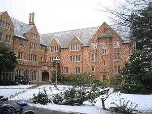 Hansee Hall is a building and student dormitory in Seattle, belonging to the University of Washington. Hansee Hall is the oldest residence hall at the university, and was constructed in the 1930s. It took its name in 1961, being named after Martha Lois Hansee.[9] Hansee was a professor of Greek language and literature who taught at the university from 1881 to 1884 and again from 1895 to 1903. Its internal divisions consist of a narrow corridor attached to four different "Houses", Blaine, Austin, McKee and Leary. In 1936, all of these took their name from prominent Washingtonian women from the late nineteenth century and early twentieth century. During the Second World War, Hansee Hall was used by the U.S. military. The building imitates the red brick style of certain Ivy League schools, and otherwise has a mixture of Tudor and Collegiate Gothic architecture.[10] The building is located off N.E. 45th Street in the north campus, just a short walk from nearby McCarty Hall. It is used as a residence hall to house undergraduates at the university, and mandates 24-hour quiet hours.[11] It was once a women-only dorm, but is now unisex.