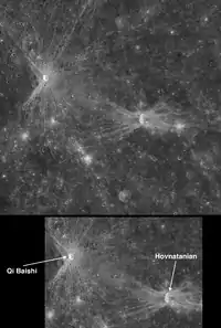 Hovnatanian is a crater on Mercury. Its “butterfly” pattern of ejecta rays were created by an impact at an even lower angle than that which formed neighboring Qi Baishi crater. From the "butterfly" pattern of rays (similar to Messier crater on the moon), the Hovnatanian impactor was travelling either north-to-south or south-to-north prior to hitting Mercury's surface.[1]