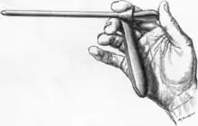 A reduced male cystoscope in holding positions.