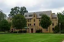 Howard Hall was the first instance of a Notre Dame building being built in the collegiate Gothic style, and together with Morrissey and Lyons they formed a semi-closed gothic courtyard that inspired subsequent gothic architecture on campus.[6] The buildings still employed the classic yellow brick and minimal limestone, in order to blend with the pre-existing campus.[7] Because of their location, new style, and beauty, the three dorms acquired the name of "Gold Coast".[8][9] Howard Hall was also the first building to be named after a lay person – Notre Dame Law Professor, poet, Civil War soldier, historian, first Laetare Medal winner and Indiana State senator and Indiana Supreme Court Justice Timothy Edward Howard.[10][11] It was the first building of the Freshman Unit to be built, and was later followed by Morrissey Hall and Lyons Hall, and when it opened in the fall of 1925 it hosted about 150 freshmen.[12]