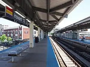 The Chicago and Evanston Railroad constructed a route from Union Station in Chicago into Evanston in 1885 that became the Chicago and Evanston branch of the Chicago, Milwaukee & St. Paul Railroad (Milwaukee Road).[3] In 1908, the Northwestern Elevated Railroad extended service north from Wilson station and into Evanston using the right of way of the Milwaukee Road.[4] The Northwestern Elevated took over the operation of passenger services from the Milwaukee Road, rebuilt the stations along the line, and added new stations including one at Howard Avenue (now Howard Street).[5] The station was rebuilt in 1921 when the line through the station was elevated onto an embankment. An escalator was added in 1964.