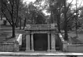 The exact origin of the tapping of the natural spring which was later Howe Springs remains unknown. The first report on the history of the site came during its construction in 1896, and it claims that the location of where the spring was constructed was originally home to a Native American settlement.[1] The origin of Howe Springs began when Thomas Marshall Howe and his family moved from Ohio to Pennsylvania and bought the location, which he named the Greystone Estate. Thomas Howe was one of Pittsburgh's most prominent citizens, involving himself in the financial and political sectors, as well as contributing to a significant amount of philanthropic work. Howe served two terms in the U.S House of Representatives representing Pittsburgh as a Whig.[2] He later would become one of the founding members of the Republican Party in 1858.[2] During the Civil War he served as Assistant Adjunct General for the Western District of Pennsylvania. Howe also turned down President Grant’s nomination for Secretary of the Treasury and President Hayes’ nomination for Secretary of War.[2] Howe also held a number of financial positions as the head of various companies during his career. The Howe family was first inspired to create Howe Springs following the devastating Johnstown Flood of 1889, with the idea of making water accessible and free to the public.[3] The first structure that was built around the spring was built by the architectural firm Alden & Harlow and was constructed by John Shreiner in 1896.[1] This structure was erected as a posthumous memorial to Thomas Howe by his wife, Mary A. Howe.[4] Following Mary Howe's death, the Howe heirs sold the Greystone Estate, which included the spring, to Michael Benedum in 1910, and included a broad clause to ensure that the spring would remain free and open to the public.[5] Michael Benedum was a wealthy businessman in Pittsburgh, making his fortune in the oil and natural gas industries. He was also an important philanthropist in Pittsburgh, and a significant historical figure. The new ownership immediately encountered problems with the spring. In April 1911 it was reported that the water in Howe Springs was found to be impure by the City Water Bureau, and city workers destroyed the structure that had fed the spring.[6] Howe's descendants, who wanted to make sure that the spring continued to be free and open to the public, took legal action against the city and the new owners.[6] In order to end the drama around the spring, a plan for a new structure was done by architect W.H. Van Tine.[7] In addition to a new structure around the spring, a new spring was also designed to be built which would improve water quality.[8] The new structure and spring were completed in 1912, and once again Howe Springs was opened to the public in its new neoclassical design.[9][10] Howe Springs was nominated in January 2016 to become a City Historic Landmark by Preservation Pittsburgh.