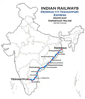 The 22863 / 64 Howrah Junction–Yesvantpur Junction AC Superfast Express runs from Howrah Junction via Kharagpur Junction, Cuttack Junction, Khurda Road Junction, Vizianagaram Junction, Vijayawada Junction, Katpadi Junction to Yesvantpur Junction.