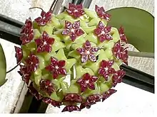 The flowers produced come in umbels of 20-30 and have a lime green corolla and bright burgundy corona. The corolla of each flower appears bent backwards and the corona protrudes out but has a flat surface. On the flowers is produced a sugary nectar and the flowers are rather short lived. Each flower is 2 cm in diameter.