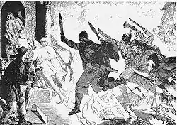 They then found out that Aðils had set the hall on fire, and so they broke out of the hall, only to find themselves surrounded by heavily armed warriors in the street. After a fight, king Aðils retreated to summon reinforcements.